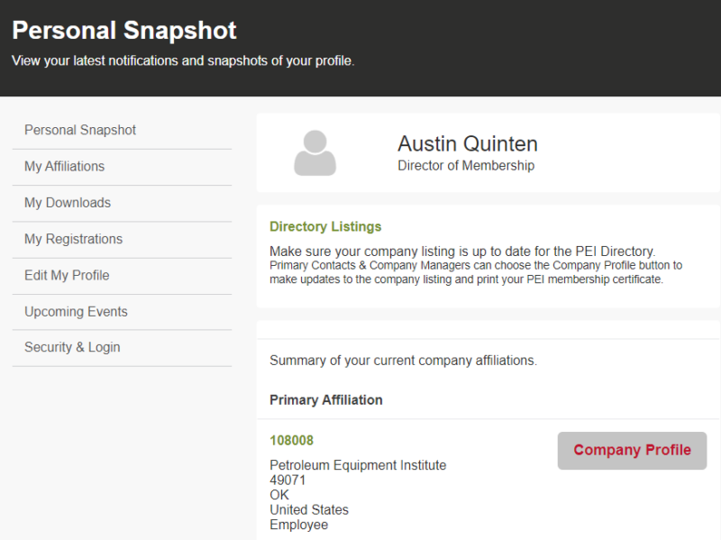 Review your company affiliations and profile. To upload a photo click the thumbnail image. Make any changes to your personal profile that you like, but make sure you save your changes. If you are the primary contact or a company manager for your company, be sure to click on “Company Profile” and keep your company information up to date! To print your PEI membership certificate, simply scroll to the bottom of the Company Profile page and click on “Membership Certificate”.